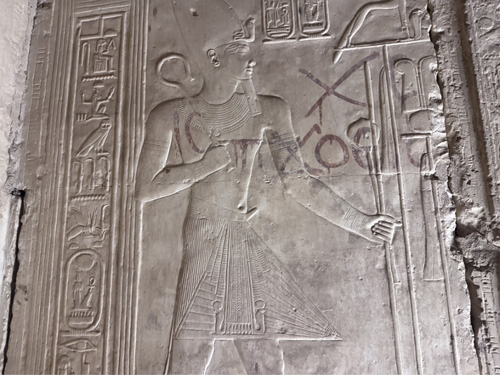 セティ一世王のレリーフの上にコプト語サイード方言で、「イエス、キリスト、主」と書かれている。ヒエログリフで書かれた中エジプト語とコプト文字で書かれたコプト語が共存する興味深い一例。