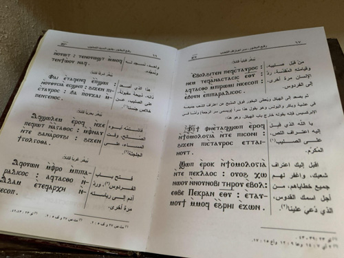 この写真は、コプト正教会の典礼書の一部で、左側にコプト語、右側にアラビア語の対訳が記されている。コプト正教会では現在もこのような形式で典礼が行われており、古代エジプト語の最後の生きた姿を伝える重要な文化遺産となっている。