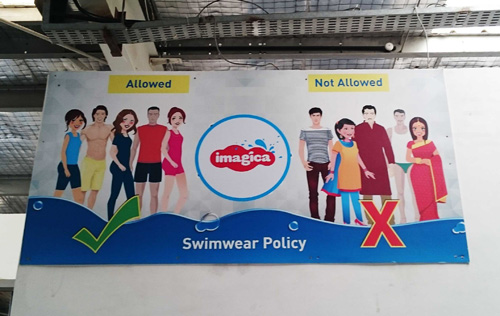 ところで、ウォーターパークの登場は、インド社会に大きなインパクトを与えたに違いない、と筆者は密かに思っている。インドでは、宗教に関係なく、男女ともに肌の露出がタブー視される傾向にある。有名なガンジス川での沐浴も、着衣のままなされるのが普通である。特に、女性が足を見せることへの抵抗感・忌避感は根強い。しかし、ウォーターパークでは、着衣での入場は禁止されている(写真1)。他者の目もある公共の場で、水着で遊ぶ男女の姿が映画のなかの話ではなく現実世界のものになったのは、インドではごく最近のことなのである。若い世代が大半を占める都市の新中間層が、伝統的なインド社会の規範から抜け出し、欧米型のライフスタイルを志向している様子を、ここに垣間見ることができる。ちなみに、ムンバイー郊外のエッセル・ワールドのウォーターパークでは、ヒンドゥーだけでなく非ヒンドゥーのファミリーも水着姿で休日の午後を満喫していた。