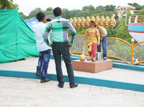 筆者がRFCを訪れたのは2014年の9月であった。ガネーシャ神の祭りの時期と重なっていたため、パーク内の目立つ場所にガネーシャ神像が設置されており、多くの人が足を止め、祈りを捧げたり記念撮影をしたりしていた。園内マップを頼りに⑤に行く途中で、インド二大叙事詩『ラーマーヤナ』に登場するラーヴァナ風の顔出しパネルを見つけたが、最初はそれが顔出しパネルとは気づかなかった。なぜなら、3人組の青年のうちの1人がパネルに顔を当て、残りの2人がスマホで写真を撮っていたからである。彼は実に見事にラーヴァナ風のパネルと一体化していた(写真2)。