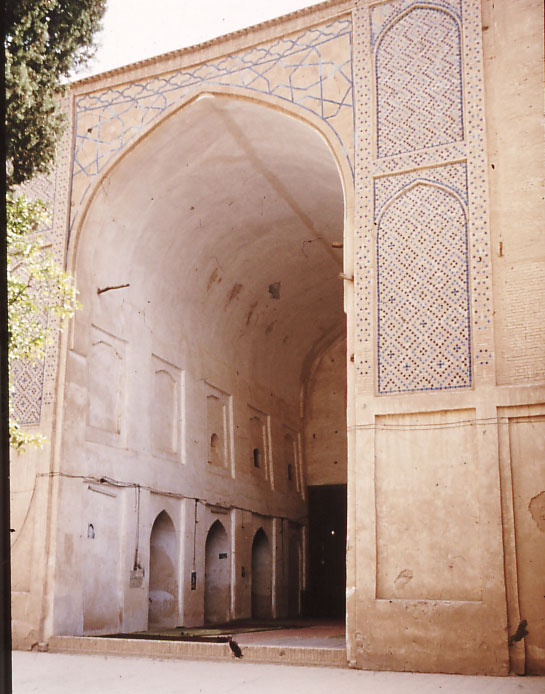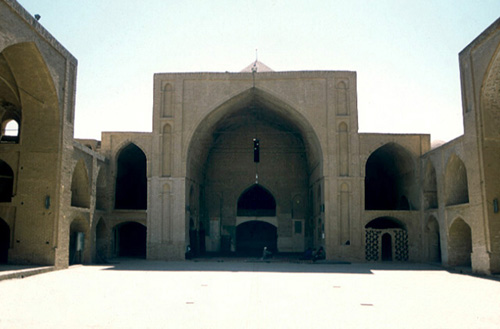 ペルシアにおけるイスラームの始まりはイスラームを奉じたアラブ軍がサーサーン朝を滅ぼした7世紀にさかのぼる。当初の遺構は残らないが、9世紀から10世紀にかけて、ダムガン、ナーイーン(図3)、ファフラージ(図9)にモスクが現存する。それらは預言者が聖遷した頃のマディーナの預言者のモスクに倣い、中庭のキブラ(礼拝の方向としてのカアバ神殿への方角)側にピア(太い構造柱)をグリッド状に立てて礼拝室とし、中庭を周廊で囲んだ多柱式である。しかし、マディーナの預言者のモスクとの差異は、細い棗椰子の幹ではなく太いピアとし、天井を平屋根ではなくヴォールト(曲面架構)とする点にある。10世紀になるとイーワーンをモスクとした例もある(図4)。先述したようにイーワーンはサーサーン朝にさかのぼる建築技法である。