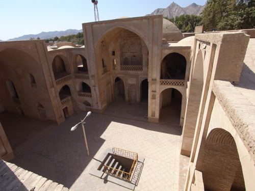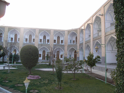王母の学院はイスファハーンにあり、マドラサ(図21 高等教育施設)、サライ(図22 中庭の周囲に2層の小室を並べた商館)、厩舎とバーザール(通り状商店街)が同梱して建設され、その美しさだけでなくイスラームにおける宗教建築の持続性を知ることのできる好例である。マドラサを維持するために他の3者からの利益がつかわれるというシステムで、イスラーム圏全域で用いられワクフと呼ばれる。