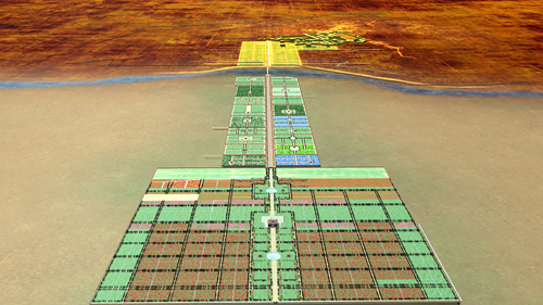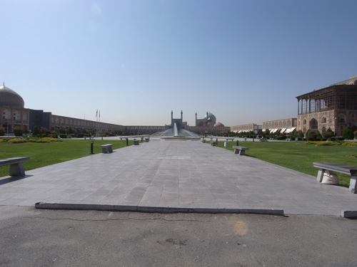 16世紀初頭から始まるサファヴィー朝時代は、ペルシア・イスラーム建築文化の絶頂期とも言える。サファヴィー朝の始祖が北西イランのアルダビールから発したことから、16世紀初頭の首都はイラン北西部のタブリーズにあり、南下しガズヴィンを経て17世紀初頭にイラン中原のイスファハーンを首都とするに至る。イスファハーンでは、旧市街の南西側に広大な広場(図17)を設置し旧市街のバーザール通りと新市街を接合、広場の西側を広大な宮殿域とし、南側のザーヤンド川を渡る直線の四分庭園通りがひかれ(図18)庭園都市として大きな発展を遂げる。