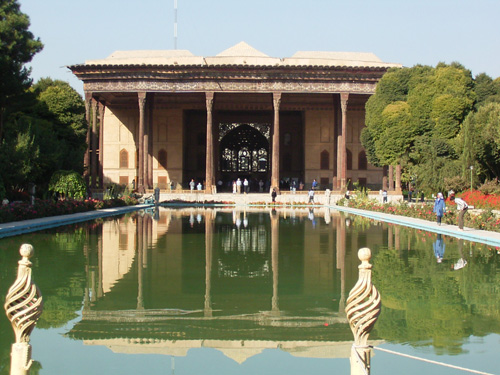 広場の周辺には秀逸な建築が残り、王のモスク(図19)はペルシア文化の復興・再編以来培われた様式や技法の集大成、聖職者長のモスクは小ぶりながら珠玉渾身の傑作、大門宮と八天宮、四十柱宮(図20)はカスピ海岸の木造技術を用いた世俗建築の秀作である。サファヴィー朝の建築の特色は、外観被覆に青を基調としたタイルで覆い、誇大な強調や単調な停滞がなく、空間と建物の連続性を円滑に進める工夫が盛り込まれる。例えば、王の広場とモスクのキブラ方向の調整や、浮かぶようなブルバスな大ドームなどにその片鱗を見ることができる。