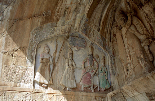 高度の建築文化を築き上げたサファヴィー朝は、18世紀半ばにはカージャール朝にとって変わられる。次の時代は1750年頃から始まり、特に19世紀になると今までと異なって西欧への視線が明らかとなる。カージャール朝はサファヴィー朝建築から脱皮する方策として、古代復興を推進した。テヘラーンのゴレスタン宮殿(図23)には円柱が使われ、アケメネス朝ペルセポリスの近くにあるシーラーズではペルセポリスの柱形式も好まれ、カージャール朝の王子が自分達を描いたサーサーン朝絵画の模写をサーサーン朝遺跡に付け加える(図24)。こうした現象の背後には、古代や柱への憧憬を通して西洋の新古典主義へと繋がろうという意図が含まれていたのではないだろうか。アーチの形も今までの尖頭アーチではなく西洋建築の半円アーチが意図的に使われる。また、同じくカーシャーンのアガー・ボゾルグ・マドラサのタイルには、今までなかった薔薇色がふんだんに使われ、花瓶から溢れ出るバラのモチーフが描かれる。ちょうどヨーロッパでは19 世紀初頭ナポレオンの妻ジョセフィーヌはバラに傾倒し、バラの品種改良が行われていた。20世紀になると若い建築家たちはエコール・デ・ボザールに留学し、直接西洋の新古典主義を移入するに至る。