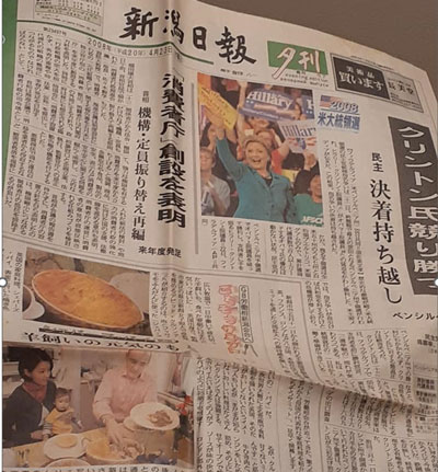 私は記者の質問に日本語で答え、このパイ料理を一緒に頂きました。自分と家族の写真が新潟日報の一面に掲載されたときは非常に驚きました(写真3)。この出来事は、私にとって貴重な経験となり、日本社会との一体感を感じるきっかけとなりました。言語学習の心理学において、統合感は進歩を促す非常に重要な要素となることがあります。私はこの点で非常に恵まれていました。
