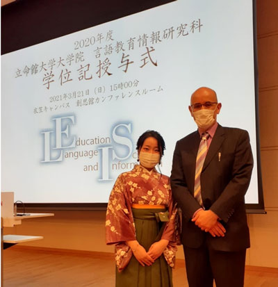 過去10年間、私は立命館大学の言語教育情報研究科で院生指導に当たっています。多くの日本語の会議に出席する必要があり、これもまた私の日本語能力の向上に役立っています。私は、英語教育や日本語教育を学ぶ院生に指導も行っています。日本での大きな成果の一つは、院生に対して英語だけでなく日本語でも研究指導を行えるようになったことです。初めて日本語で院生の研究を指導したときは、非常に躊躇し、緊張しました。しかし、その戸惑いの中でも一つのテーマを掘り下げることで、研究指導の達成感と強い充実感を得ることができました。