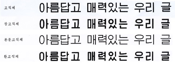 第四に、「青峰体(Chong-bong-che)」は、今日の朝鮮語の筆文字書体の伝統を継承し、発展させた書体である。青峰体は活字体からデジタル書体に移行する際に、全体的に字面の比率が小さくなり、視認性と可読性を高めるように設計されている。この書体は横書きを意識して多くの字形が修正されており、文字の空間構成が均一で、字形の完成度が非常に高いため、横縦の組版に使用しても遜色がない。全体的に文字間の間隔が均等で、画数の多い文字には錯視調整が施されている。