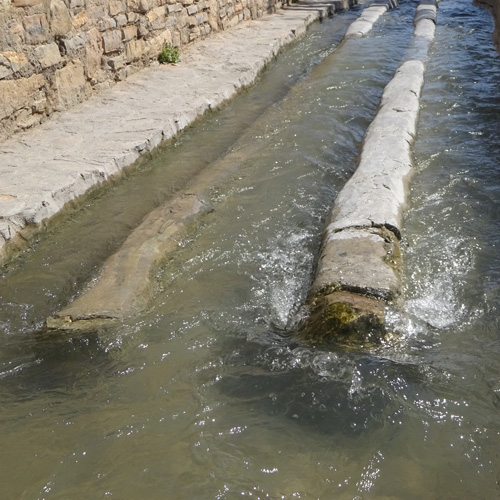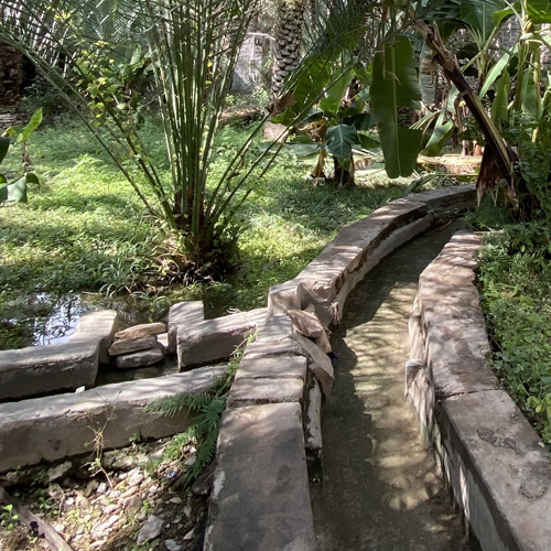 ルスタークのアフラージュの特色は、水というより湯が流れていることである。覗きこんだだけでムワッとした気に顔を打たれるが、ナツメヤシをはじめとするこの土地の作物にとっては何のこれしき、小魚まで泳いでいる。お年を召した方が「ほれ見てみ。この魚はサッドゆうねんけどな、わしらの小さい時分にはパンに練りこんで食べてたんやで」と案内してくださったのは、かつての洗濯場の跡である。井戸端会議で何を話していたのだろう。すべてを見守り、水の分配を律してきた日時計は何も語らないが、アフラージュが土木工学的存在のみならず、共同体の運営にかかわる社会的存在でもあったことをうかがわせる。