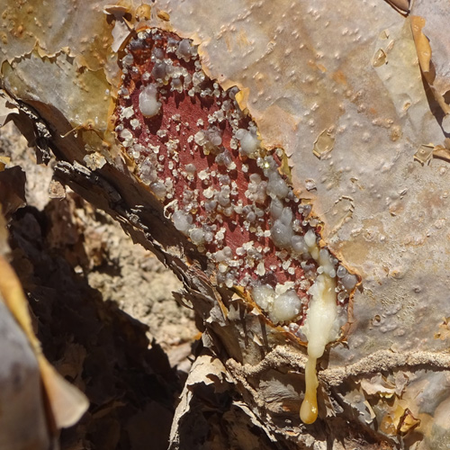 現に樹脂がしみ出ているところもすぐに発見できる。傷つけられた部位は内側の赤茶色が露出して痛々しくもあるが、そこに粘り気のある透明な液体が分泌されている。鼻を寄せれば、すでにかぐわしい。さらにじわじわとしみ出て大きくなり、乳白色の塊となったものが、削りとられて出荷されていくのである。わずかに青みを帯びた不純物のないものが上等とされ、赤っぽく混じりけのあるものは値落ちする。