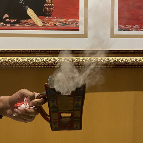 乳香に限らず、お香や香水はオマーンの老若男女のたしなみである。マスカトのリヤーム公園には香炉を模した巨大なモニュメントがあり、近年に出版された『オマーン方言手帳』の表紙にもなっているが、著者S先生に尋ねると、なにか一つオマーンらしいものをということで選んだのがそれだそうである。香炉は会合のお開きの合図にも使わることがあり、筆者が小耳に挟んだ話では、国王に拝謁したとき、定時になると式部卿がお香をくゆらせながら現れるのだという。香り好きなオマーン人たちは、日本の春のイメージとして知られつつある桜にもむせるほどの香気を期待している節があり、美学の違いを感じなくもない。