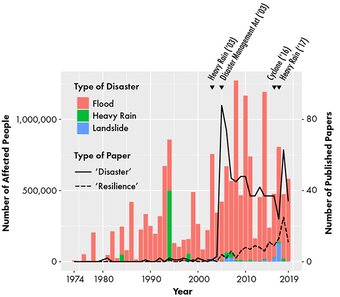 興味深いことに、研究動向を見ると、2004年以降にスリランカ国内の災害関連論文が急増し、その約10年後からレジリエンスを扱う研究が漸増している(図1)。前者はインド洋大津波や民族紛争に関連し、後者は仙台防災枠組の採択に加え、DMCが公表した「コミュニティ・レジリエンス・フレームワーク(CRF)」(DMC, 2015)など、国際・国内の枠組み整備と連動していると考えられる。