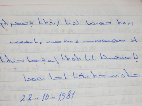 若者は訪問記念と言って私のノートを開くと、教会で習ったというシリア語で書き始めた。シリア語は、アラビア語が普及する以前、西アジアで広く使用されていたアラム語の系統に属し、独自の文字を持ち、ジャズィーラ地方を中心にシリアのキリスト教徒が用いる言語として知られていた。しかしそれまでダマスカスで知り合ったスルヤーンの若者の中にシリア語の読み書きができる人はほとんどいなかった。また当時ダマスカス大学の歴史学科にはシリア語の母というべきアラム語の授業はあったがシリア語自体は教えられていなかった。そのためシリア語は典礼用語として生き残っているものの、現実的には近い将来消滅する可能性の高い言語というイメージを持っていたが、この若者を見てそのイメージは払拭されることになった。シリア語は力強く生き残る生命力を持った言語だったのだ。ダマスカスのシリア正教会でも一般信徒向けのシリア語講座が開講されていたことを知ったが、ダマスカスよりジャズィーラ地方の教会の方がシリア語教育に関して積極的だったのかもしれない。それから1年後ハサカからやってきた知人からあの若者がその年(1982年)の6月に始まったイスラエルのレバノン侵攻に伴う戦闘で戦死したことを聞いた。シリア語文化の支え手、シリア人でありアッシリア人でもあった人間が一人こうして命を落とすことの意味はなんだろう。どう受け止めるべきか考えさせられた。