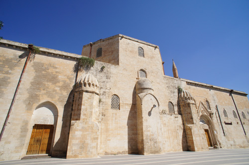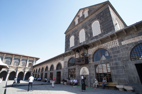 預言者のモスクに倣い中庭のキブラ(マッカに至る礼拝の方向)に柱をグリッド状に建て礼拝室とし中庭を回廊で囲む多柱式(図3)は、少数派である。ウマイヤ朝期のハランの大モスクはこのタイプであった可能性もある。一方、ディヤルバクルの大モスク(図4)はダマスクスのウマイヤ・モスク同様に中央キブラ軸を強調して教会のような切妻ファサードをみせる。この二つはシリアからの影響と考えられる。