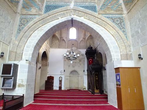 図6 マラティヤの大モスク(1224年)。現在は礼拝室ドーム(2スパン四方)前の中庭に面するイーワーン(写真、同)と中庭(間口2スパン奥行5スパン)周りの多柱室の構成である。創建以来、14世紀後半にはマムルーク朝の改築、オスマン朝の再建などを経ており、創建当時は、礼拝室前イーワーンに対峙する北側イーワーン(2スパン四方)をもつ2イーワーン形式であったと想定される。フワンド・ハートゥーンのモスク(カイセリ、1238年)では、縦横2スパンのドームの手前に2スパン分の大アーチがあり関連性を示唆する。しかしながら、イーワーンは後述するマドラサでは多用されるが、モスクでは根付かなかった。