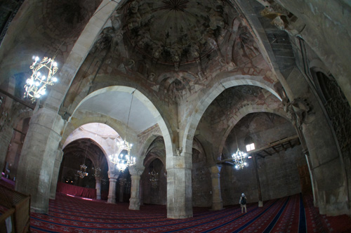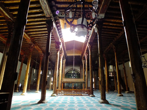 図9 ベイセヒルのエシュレフォール・モスク(1299年)。東北部に斜めに切り取られた部分があるが、平面の基本は間口7間奥行9間にグリッド状に木柱を立て、奥行方向(写真奥方向)に梁を渡し、根太天井を架ける。中央には明かり取りのためにベイを開放し、中央ミフラーブ前の1ベイだけはレンガ造としドームを冠する。同様な作例として、アンカラのアスラン・ハーネ(1290年)、アフィヨン(1272年)、マフムート・ベイ(カスタマヌ、14世紀)、シブリヒサル(1231/2年創建、修理)と共に「中世アナトリアの木造列柱モスク」として世界遺産に登録された。これらは、アナトリア半島の中北西部に位置する。