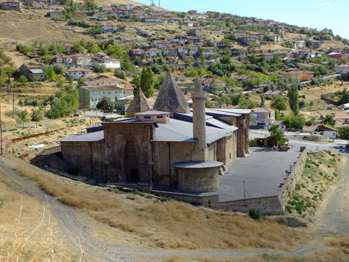 図10 ディブリーの大モスクと病院(1229年)。大モスク(写真手前)は、北辺中央と西辺に入口をもち、北西部に円形のミナレットを立てる。間口5間奥行5間ながら、異なるスパンにピアを並べ、実際には南北に長い建物である。中央ベイを明り取り窓とし、ミフラーブ前の正方形ベイにドームを載せ、その外側には8角錐状の屋根を架ける(写真中央)。一方、病院は大モスクの南側に続き、西側に入口をもち(写真右奥)、中庭となる中央部分に4本の柱を立て屋根をかけ、東にイーワーン、南北辺に小室を2層に配置した2イーワーン式のようなプランで、北東部の一室を墓とする(写真左側の8角錐屋根)。