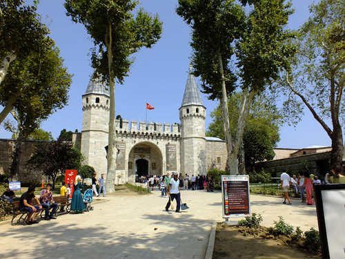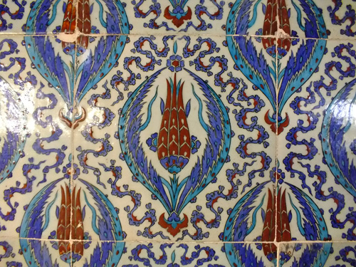 そのほかにも数多くのモスクがイスタンブルを始め各地に建設されるが、特にセリム1世、スレイマン大帝、セリム2世、ムラト3世の黄金期のスルターンに仕えた建築家シナンの功績が大きいとされる(図20)。彼は、スレイマニエでハギア・ソフィアのドーム構成に挑み(図21)、セリミエ(図22 エディルネ)ではハギア・ソフィアの直径を凌駕する大ドームを構築した。そのほかにも現在のトルコ共和国をはるかに超えて広がる帝国の各地に、モスクや公共建築を建設した。また、スレイマニエ建設のために開発されたという白地に青、緑、黒、赤の植物紋様を絵付したイズニク・タイル(図23)は、ペルシア風のタイルからの飛翔を示す。商館建築、橋梁、公衆浴場など世俗建築の定型化も重要である。忘れてならないのはトプカプ宮殿(図24)で、マルマラ海と金閣湾に臨み、入口の第一中庭からスルタンの私的空間に至る男性用のセラムリクの軸性、スルタンの後宮のハラムリクまで、15世紀半ば以後の各時代の様式を観察することができる。