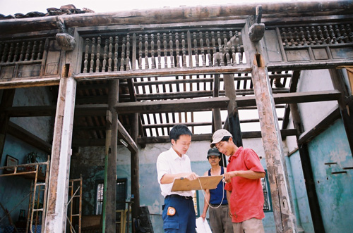 このような政策、技術、予算、組織(人員)などの体制が整い始め、ホイアン旧市街地の町並み保存は、1990年代後半から飛躍的に進むことになる。JICA(国際協力機構)による専門家派遣なども行われ、町並み保存の人材育成や体制整備が、国際支援のもとで進んだ。筆者自身も、2003年~2005年まで、JICA青年海外協力隊員として、ホイアン文化遺産保存センターで、町並みの保全、家屋の修復事業等に従事した(写真3)。