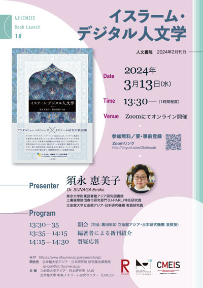 2024年3月14日(水)13:30~14:30、オンラインにて2月に出版された『イスラーム・デジタル人文学』(人文書院)のブックローンチを開催しました。本書は、Dr.須永恵美子(東京大学附属図書館アジア研究図書館上廣倫理財団寄付研究部門特任研究員、立命館大学立命館アジア・日本研究機構客員研究員)と熊倉和歌子慶應義塾大学教授の共編著です。