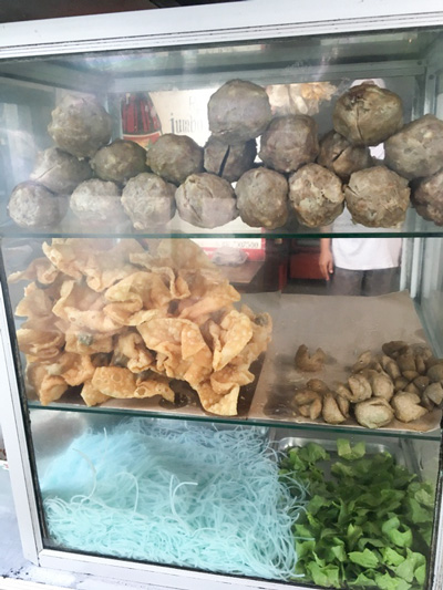バッソ屋台:バッソ(肉団子)やワンタン揚げ、春雨や麺、豆腐などを何個入れるか指定し、お会計をする。バッソは肉だけのプレーンなもの、内臓や軟骨入りの歯ごたえのあるものなど選べる(2017年4月26日)。