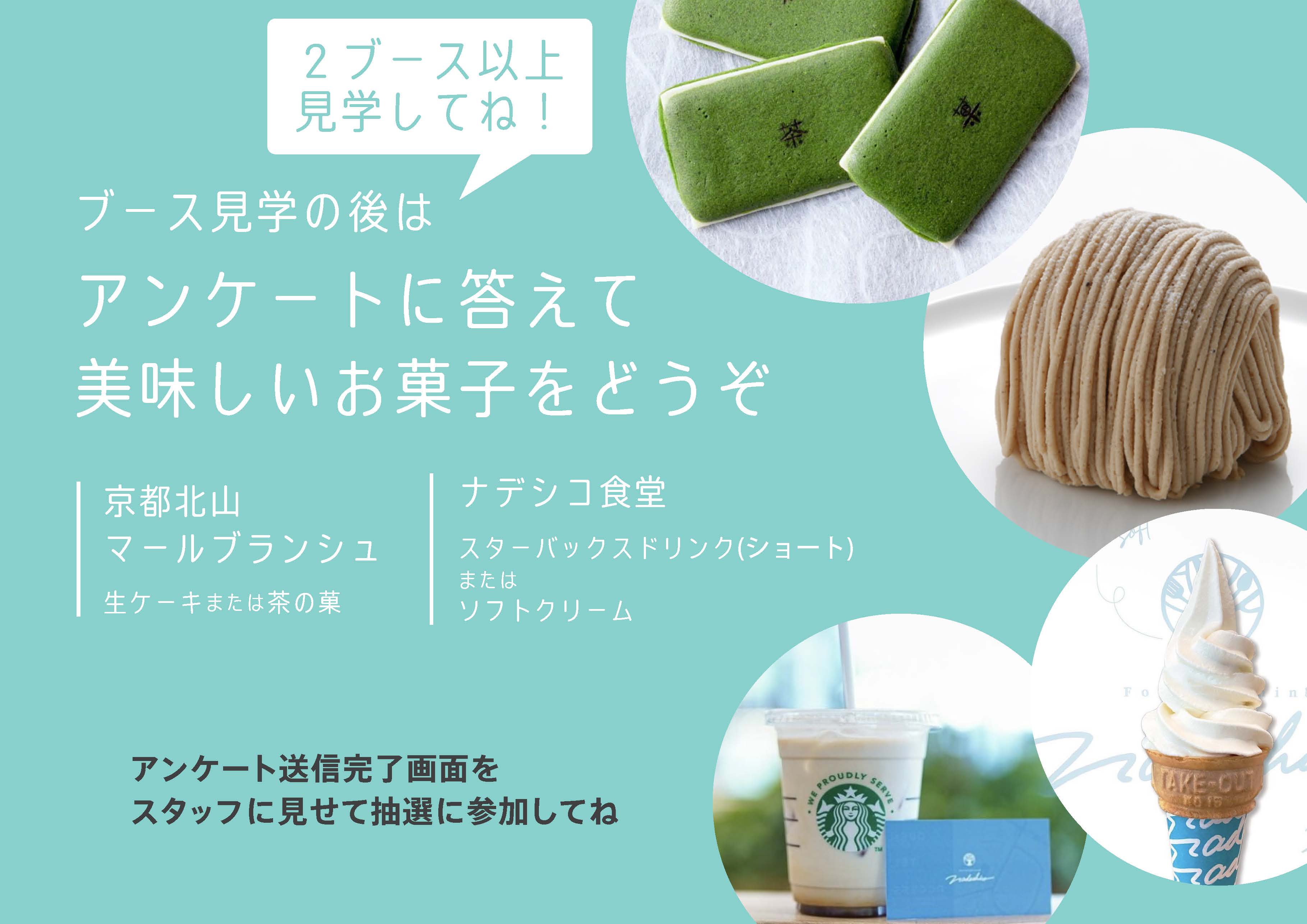 ブース見学の後は、アンケートに答えて美味しいお菓子やドリンクが抽選でもれなくもらえます♪♪(2ブース以上見学してね)