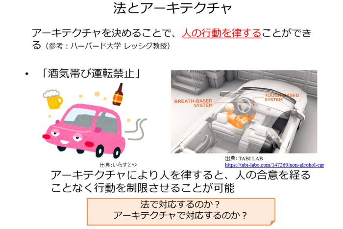 さらに、法とアーキテクチャもトレードオフの関係にあるという。たとえば運転者の呼気からアルコールを検知したらエンジンがかからなくなるような自動車をつくれば、飲酒運転を禁止する法規制と同等の効力を発揮するかもしれない。しかしアーキテクチャで人の行動を制限することはどこまで許されるのか、今度はその線引きを考える必要が生じる。
