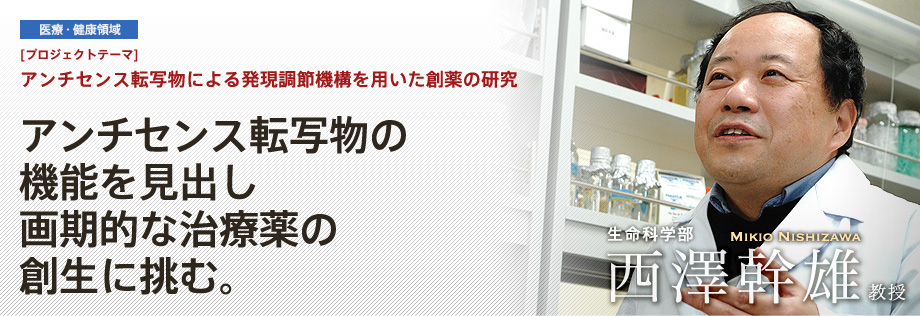 遺伝子(DNA)から転写されたRNAには、DNAに書き込まれた情報をタンパク質に翻訳するためのメッセンジャーRNA(mRNA)の他に、タンパク質をコードしないRNA、すなわちノンコーディングRNAが存在します。最近の網羅的なトランスクリプトーム解析によって、予想以上に多くのノンコーディングRNAが存在することが明らかになりました。このプロジェクトで着目する「アンチセンス転写物」は、アンチセンスRNAともよばれ、遺伝子のアンチセンス鎖と同じ配列を持っていて、ノンコーディングRNAの一種です。私たちは、アンチセンス転写物が、それまで考えられていたような単なるジャンク(くず)ではなく、さまざまな機能を持つのではないかと考え研究を続けてきました。その結果、アンチセンス転写物とmRNAが互いに影響することで、タンパク質の発現を調節するメカニズムを世界に先駆けて解明しました。
