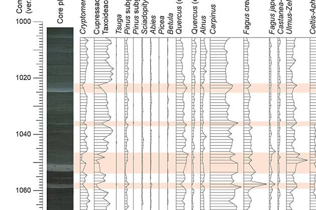 年縞の1年分は、わずか0.6~0.7mm。その1枚1枚に含まれる放射性炭素(¹⁴C)濃度から年代を測定する。その他、火山灰や砂などから噴火や地震、台風の跡を発見したり、また花粉を分析し、植生を明らかにすることで、気候を突き止める。