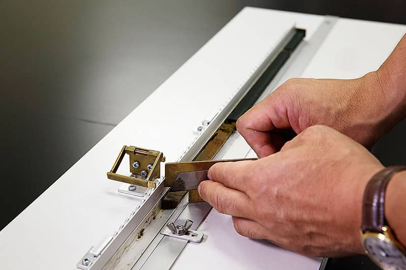 [センチスライサー]年縞の試料を切り出すためのセンチスライサー。同じ厚さのものを効率よく切り出すための道具で、中川による自作。組立に必要な部品は最小限で、いずれもホームセンターで購入が可能。センチスライサーの他に、ミリスライサーもある。