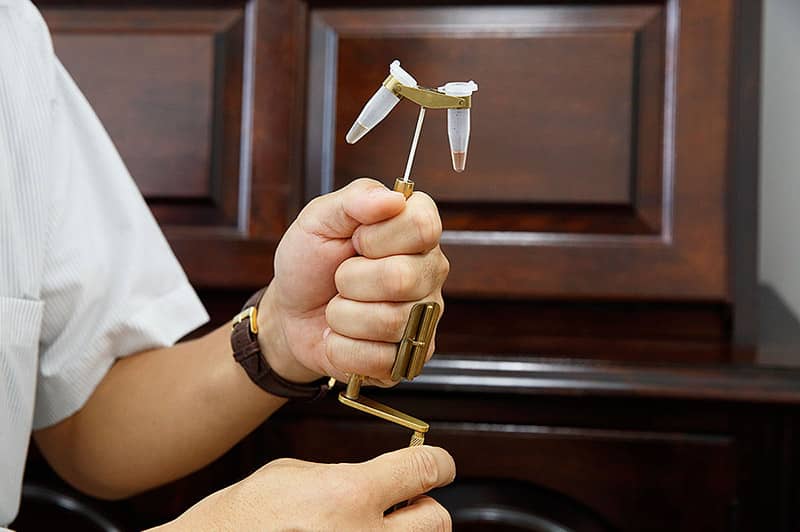 [手元遠心分離機]年縞から取り出した花粉を濃縮するためには遠心分離機にかける必要がある。花粉の数をカウントするために顕微鏡に乗せる試料を濃縮するためだ。中川は、旅先でもどこでも思いついたときに実験室に行かなくても分析できるように、と開発。手元で操作できるものを自らつくりだした。下のハンドルを一回転させると、上の試料は100回転する仕組み。