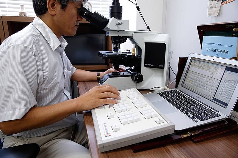 [PolyCounter]花粉分析は、試料ごとに花粉の数をカウントし、当時の植生を再現していく。そのためには、一試料につき樹木花粉を400個以上カウントすることが求められる、地道な作業だ。中川が開発した「PolyCounter」は植物ごとに設定されたキーを押すことでカウントができ、多種にわたる花粉のカウントが可能になった。「PolyCounter」が開発される前には、顕微鏡を覗きながら手元で「正」マークをつけながら400個以上になるまでカウントをしていたのだから。このカウンターが作業の省略化に果たした役割は大きい。植生復元のデータベースとも連動したソフト「Polygon」はWeb上で無償公開され、だれでも活用できるようになっている。