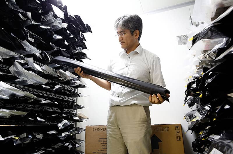 [古気候学研究センターの研究室]研究室には、顕微鏡や中川がつくった道具の他、巨大な「冷蔵庫」も。約450個の年縞の試料が保管されている。庫内の温度は4℃に設定されている。試料が乾燥しないようにラップでくるんだ後、真空パックに収めている。イギリスのニューカッスル大学から本学への着任時には、2トン分の土を運んだ。