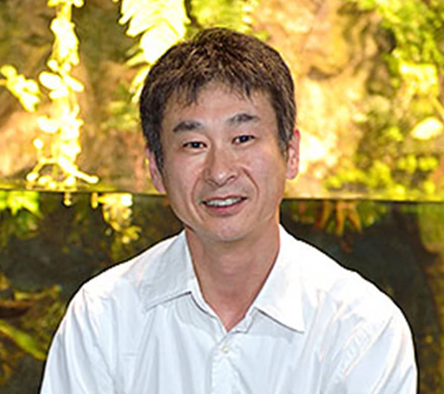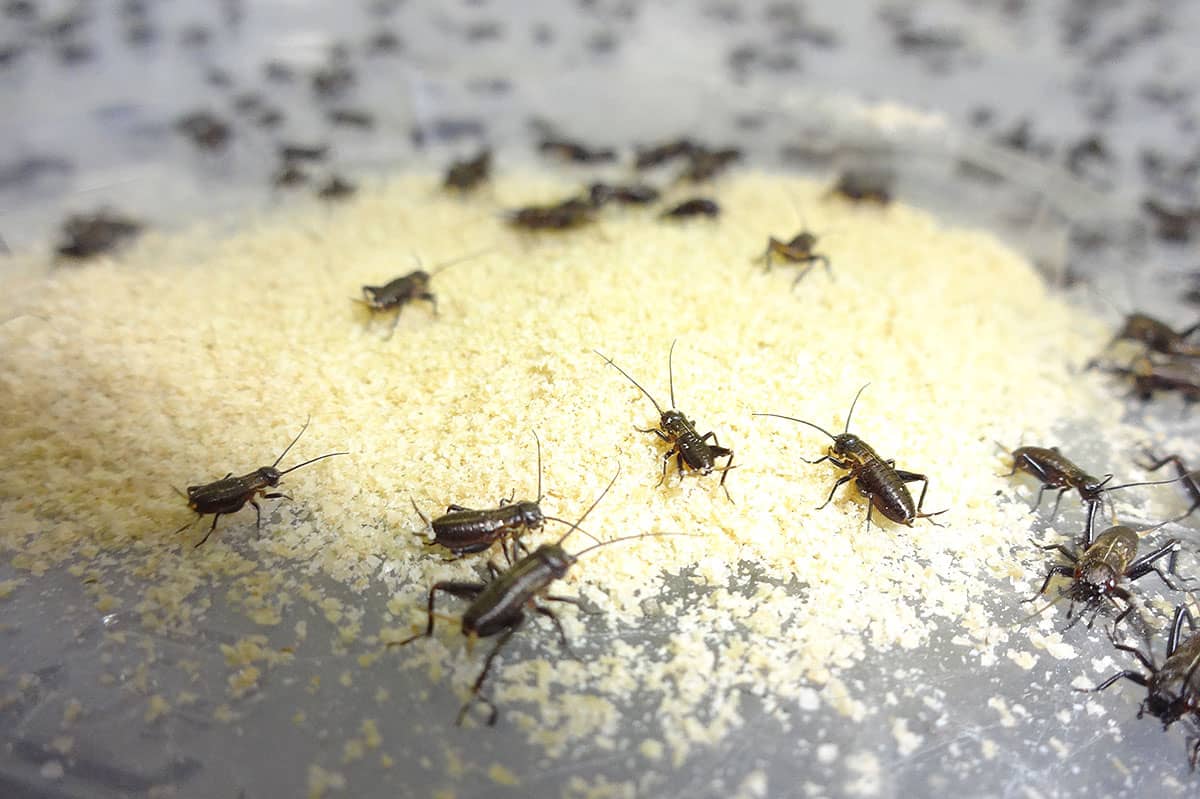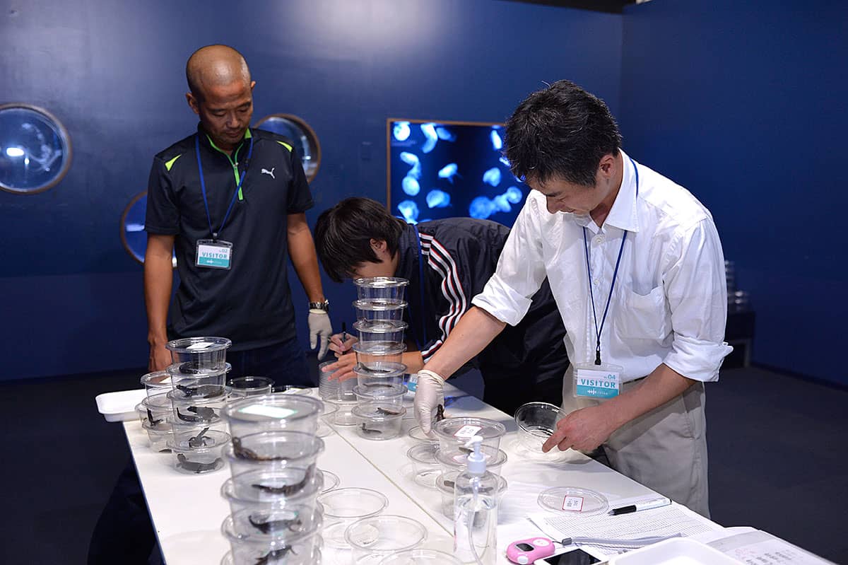 「安定同位体分析をサンショウウオの粘液という未知の試料に適用する場合、まず知らねばならないのが、炭素や窒素の濃縮係数です」と言う神松は、京都水族館が飼育する9種類の日本産固有種のサンショウウオを用いて、濃縮係数の算出に挑んでいる。それは米ぬかだけを与えてコオロギを飼育するところからはじまる。食物連鎖の起源をはっきりさせたこのコオロギをエサとしてサンショウウオに与えるためだ。体内の安定同位体の比率が安定したところで粘液を採取して安定同位体比を測定し、濃縮係数を導き出す計画だ。