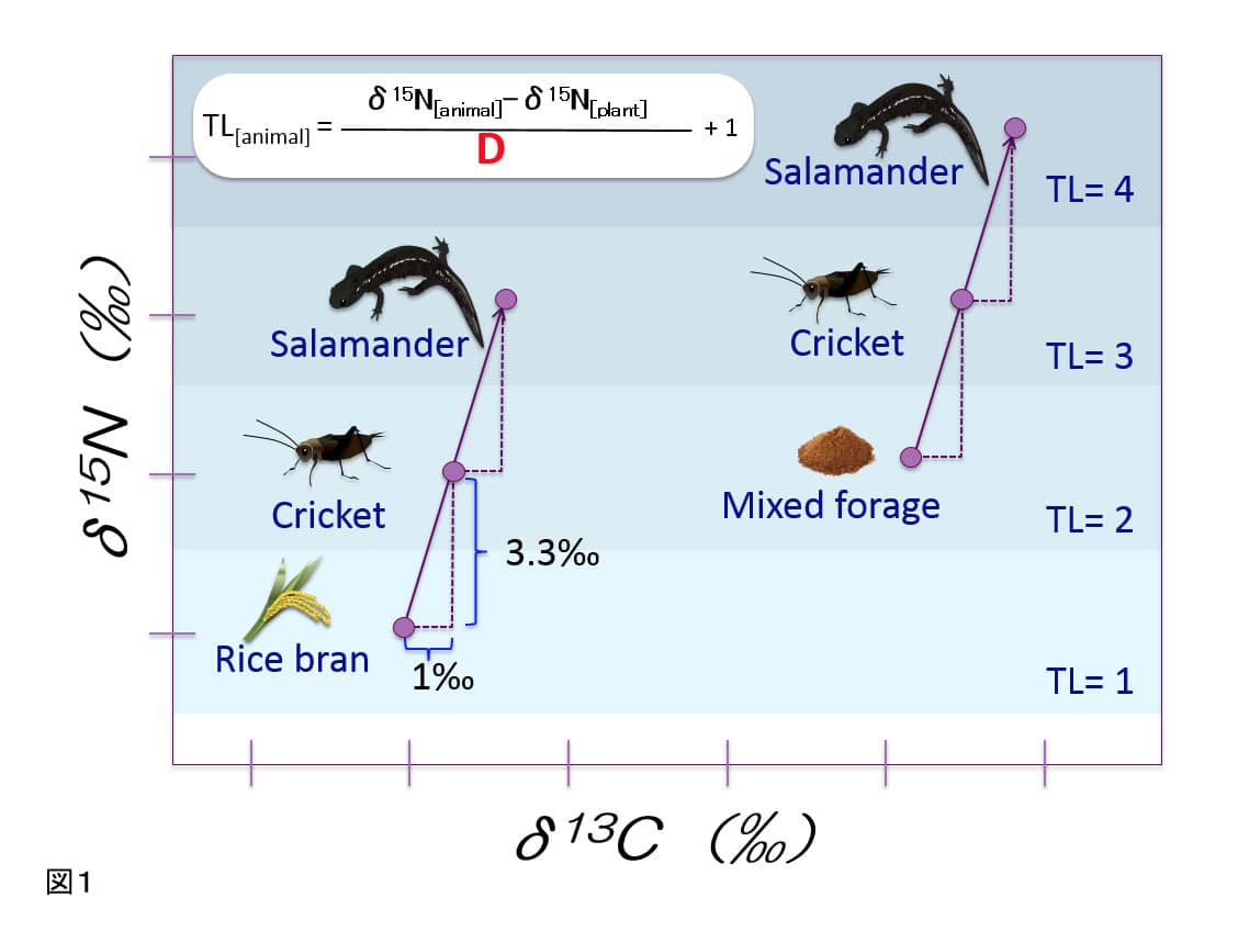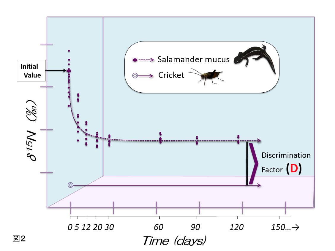 サンショウウオに配合飼料や野菜を与えたコオロギを3ヶ月間餌に与えた後、半年間米ぬかのみで育てたコオロギを餌に飼育する。任意の時間間隔で粘液を採取し安定同位体比を測定する。サンショウウオ個体および、個体間の値のばらつきが小さくなったところで、米ぬかコオロギの同位体比との差分を取り、濃縮係数(D)を算出する。