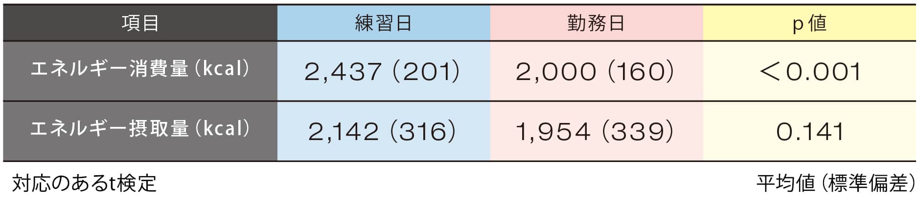「休日の練習日では、平日にトレーニングをあまりしない時のような食事をしては良くないですし、逆もまた同様です。研究結果から示唆されたのは、練習日のエネルギー摂取量を増やす必要性でした。具体的には炭水化物やたんぱく質を運動量に合わせて摂った方が良いということです。仕事をする平日は、エネルギー消費量と摂取量がほぼ同じです。ところが練習日のエネルギー摂取量は、消費量より約300kcal不足していました。この状況を続けていると体重が減っていくと予想されます」