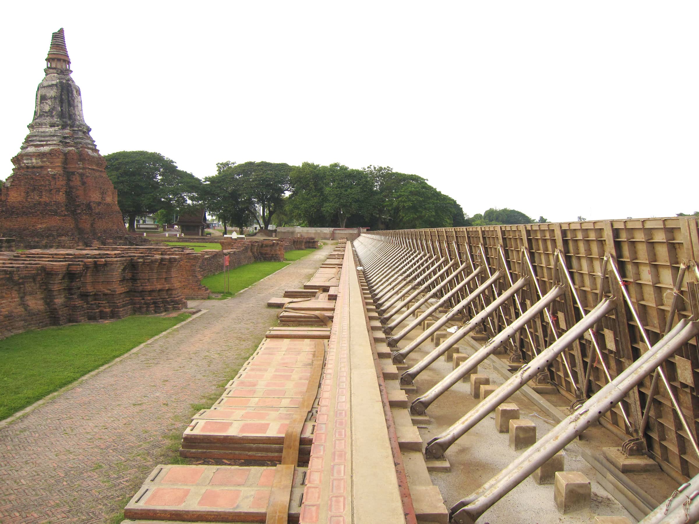 それまでに何度も遺跡が浸水する大洪水に見舞われたアユタヤ市は、今回の洪水に備え、川沿いにある市場に応急的な土の堤防を設置した。ところが、「市場の面積が狭まり、商売に支障をきたす」という理由からこれに反対し、堤防を破壊してしまったのが、市場に集まる商店主たちだった。最終的には商店主も堤防を築くことに同意したものの、時すでに遅く、新しい堤防が十分固まる前に水かさが増し、堤防は決壊。文化遺産群は水に没した。