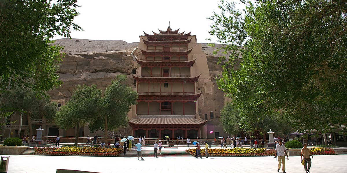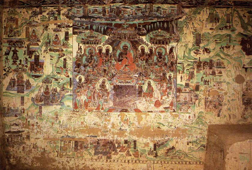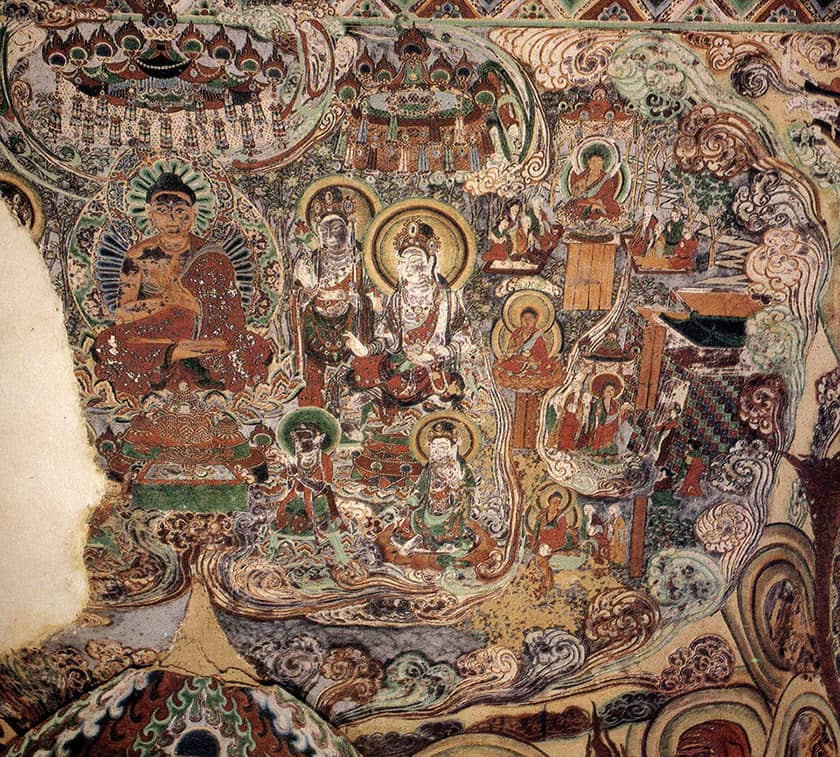 中国の史書に、西域との境界に位置すると記され、シルクロードの要衝として、古くから栄えた敦煌には、仏教石窟として著名な莫高窟がある。比較的早期にあたる5~6世紀頃の莫高窟壁画には、インド・中央アジア的な造形要素も見いだされるが、唐による西域への進出時期であった7世紀後半~8世紀前半の莫高窟壁画は、都、長安からの中国美術の影響を、リアルタイムで受けていたとされる。