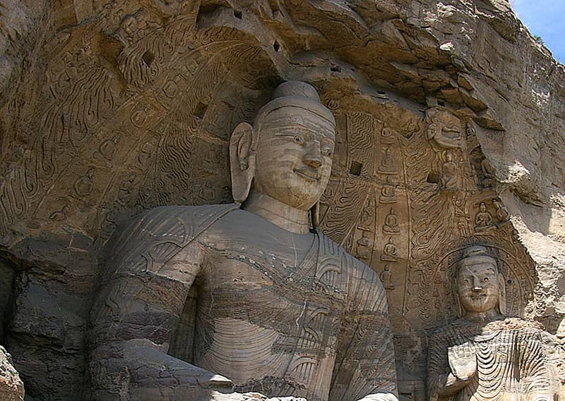 中国や日本の仏像でも、光背は表現されるのですが、とりわけ、東アジア地域の比較的早期の仏像には、火焰光背と呼ばれる、光背が燃えさかるような表現を持つ例が、数多く見受けられます。図❺は中国の雲岡石窟第20窟(北魏時代、5世紀後半)の仏像ですが、火焰光背が確認できますね。