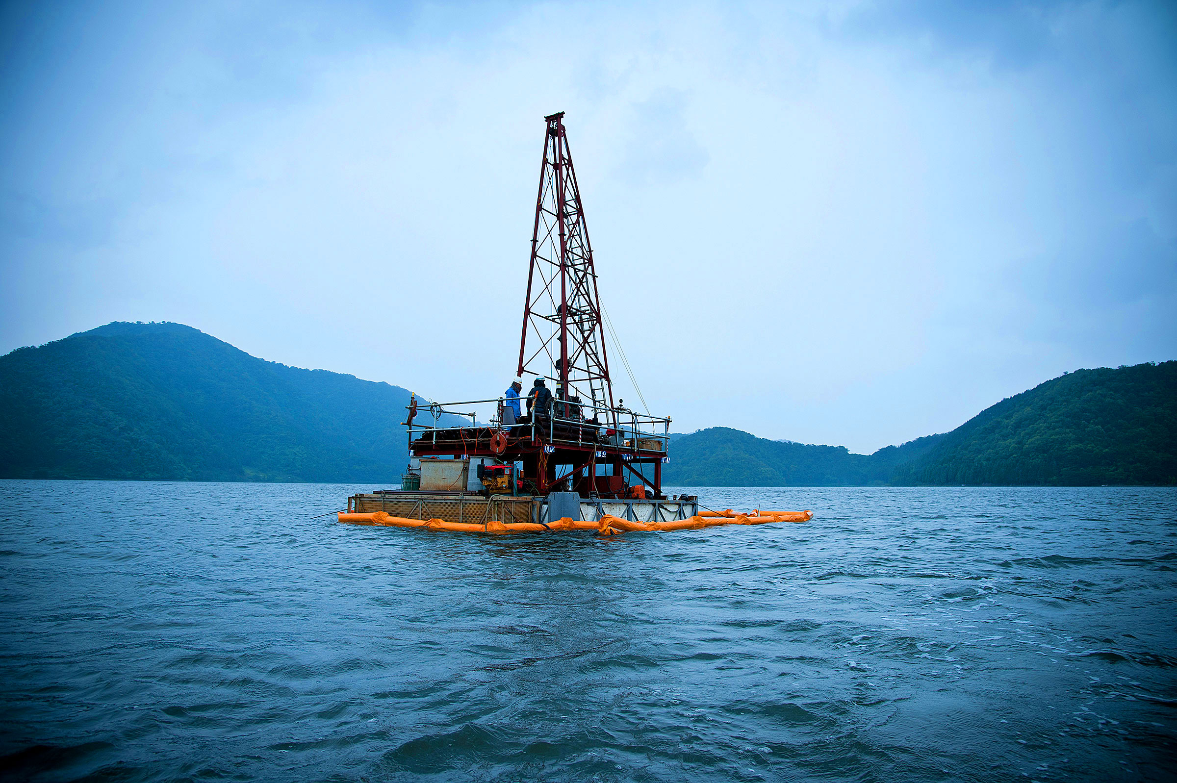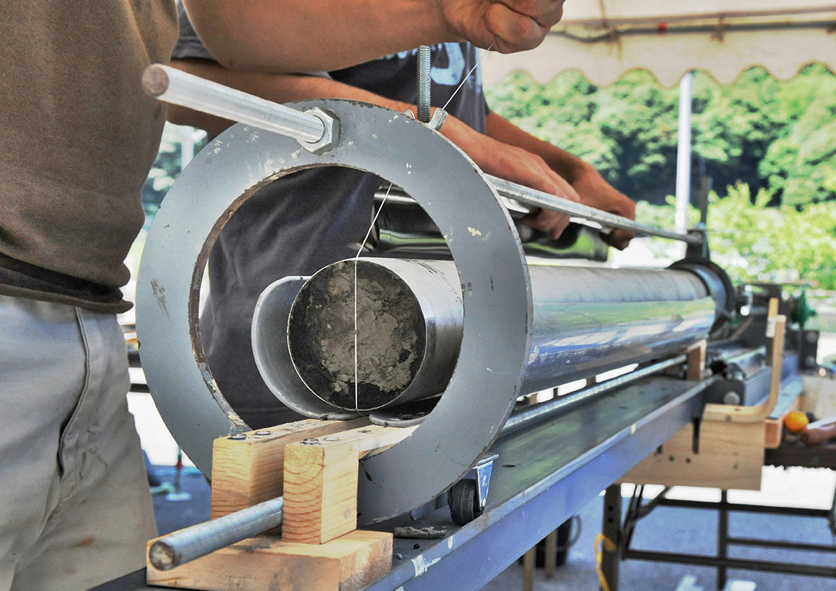 船上から長いドリルを下ろして湖底を掘り、湖底の堆積物を柱状に掘り出す。中川が独自に開発した方法で、筒に詰まった堆積物を真っ二つに切り、年縞の断面を明らかにした。