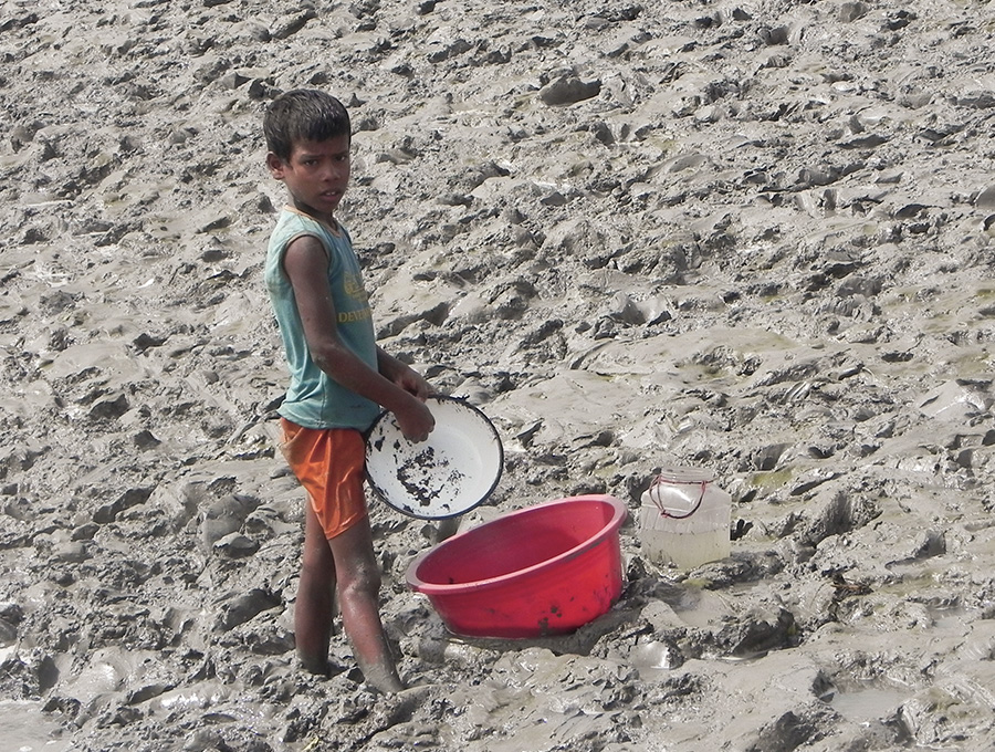 A Bangladeshi child catching small fish.