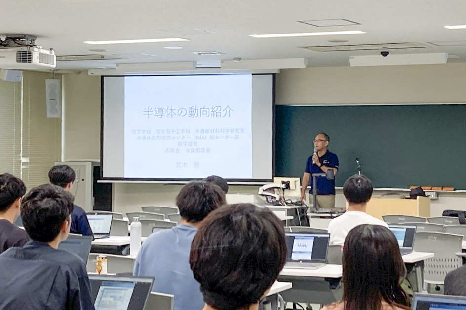 続いて、理工学部 荒木 努 教授より「半導体の動向紹介」と題して、半導体の開発・製造における日本の立ち位置が紹介されました。データセンターの電力消費が社会問題となる中、半導体は情報通信技術の革新に必須の要素であると同時に、電力消費の要でもあることが紹介され、半導体の技術革新の重要性が示されました。