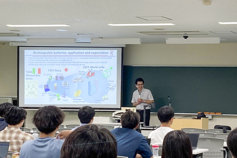 続いて、生命科学部 折笠 有基 教授より「電池・水素の動向紹介」と題して、カーボンニュートラルに必須となる革新的電池開発、水素製造技術の開発動向の紹介がありました。リチウムイオン電池が発火などの課題を抱える中、次世代電池の開発が求められていますが、リチウム電池を超える性能を有する電池開発の技術的なブレイクスルーの難しさが示されました。