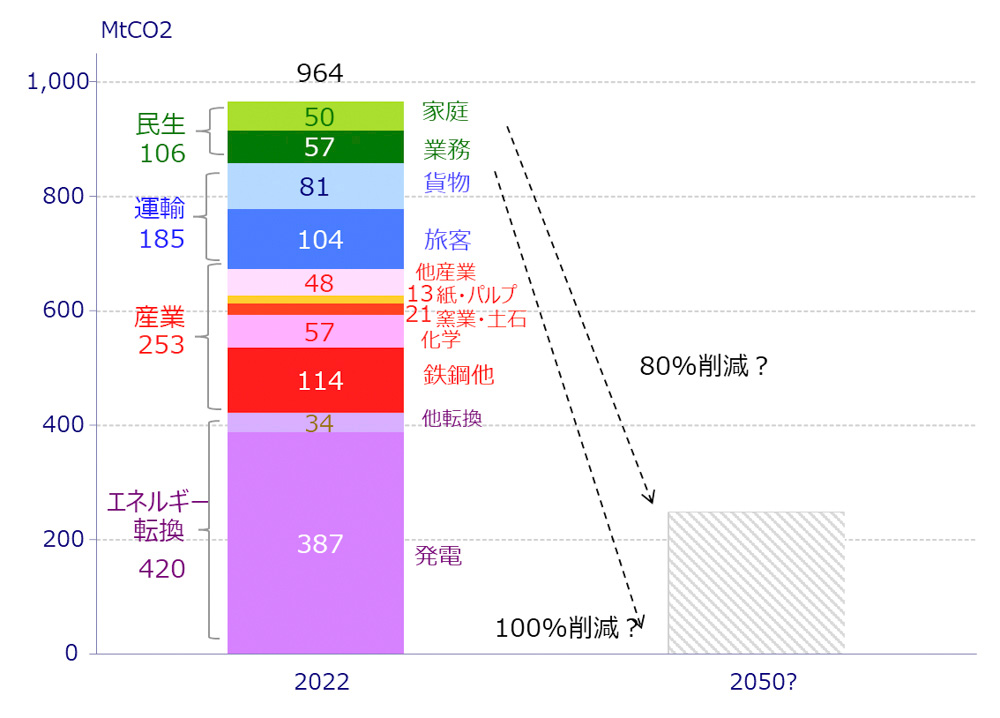 部門内訳:エネルギー転換部門(発電等)、運輸部門(自動車・鉄道・航空機・船舶)、民生部門(家庭・業務)、産業部門(工場)