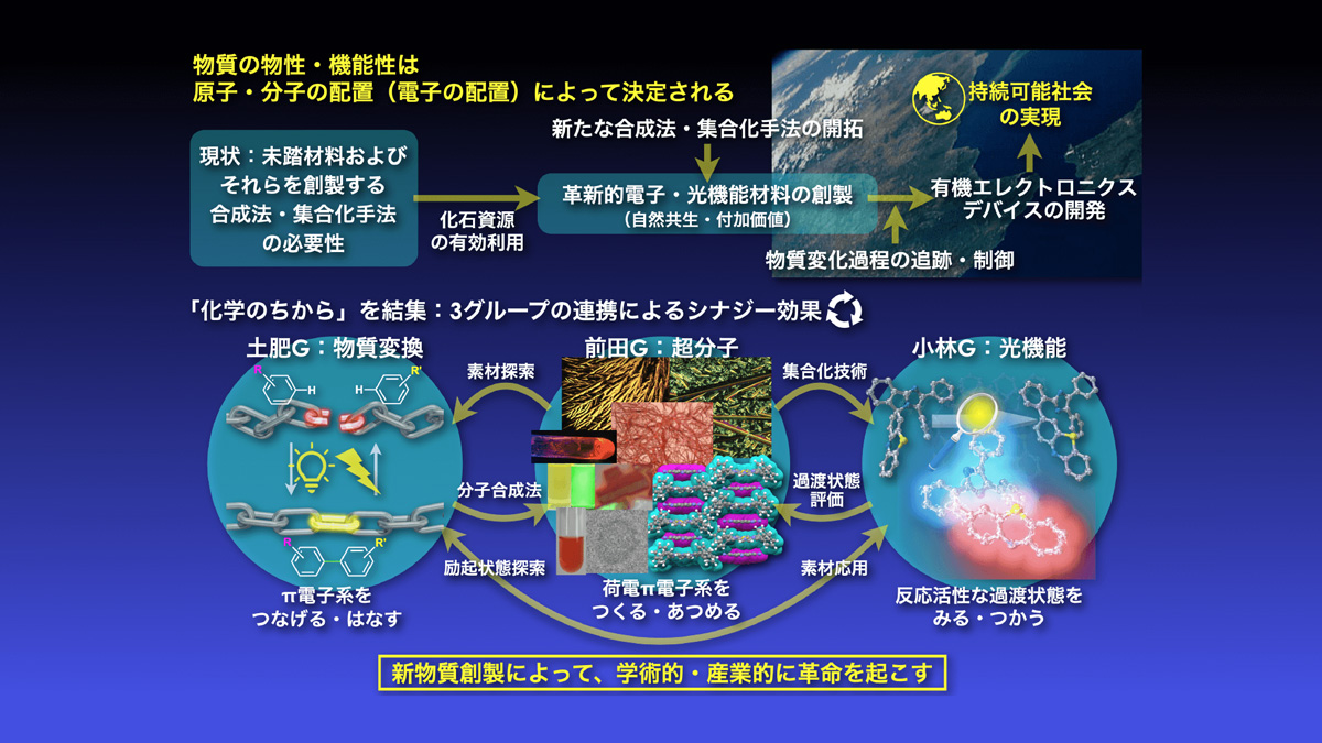 グループ1は、グループ2で創製された荷電π電子系の提供を受けて研究を行うほか、さまざまな共同研究を行うことで、時空間制御反応システムを活用した新材料の創製にも挑戦します。