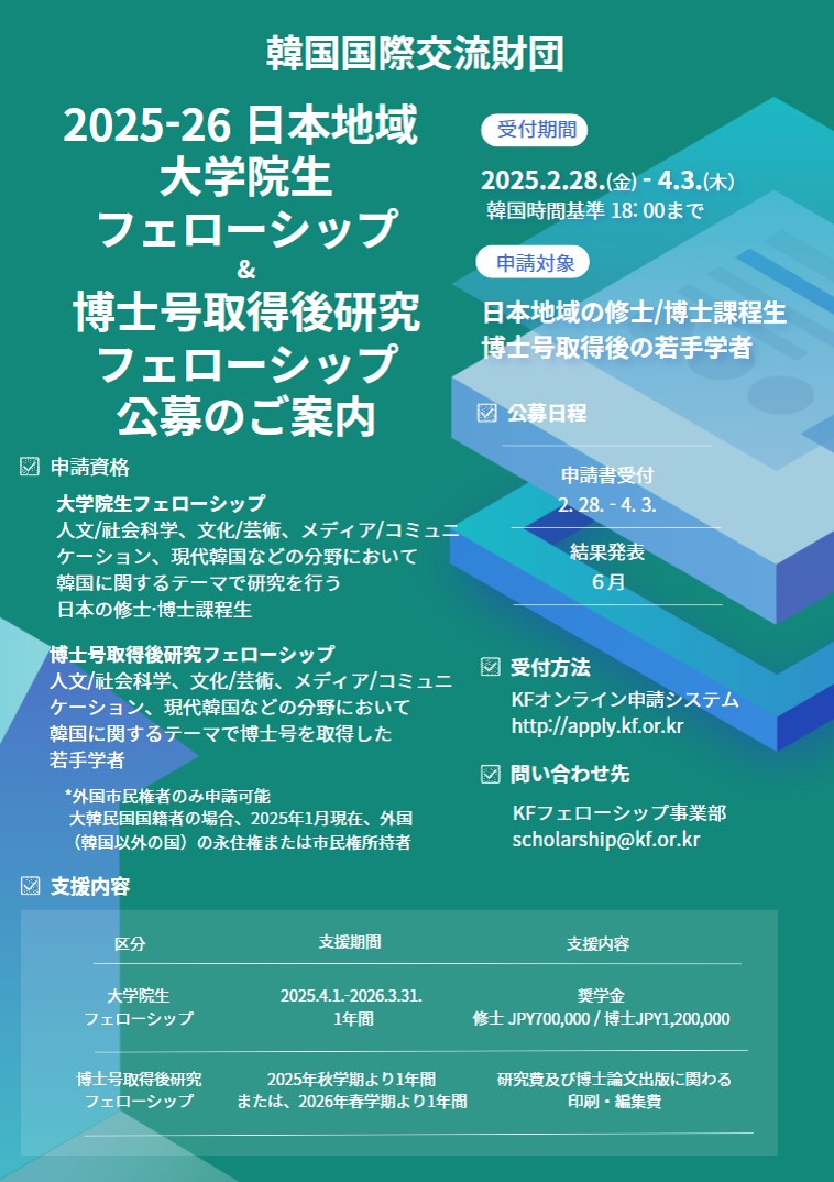 対象者:韓国関連分野を専攻する大学院生(博士前期・博士後期)および博士号取得者