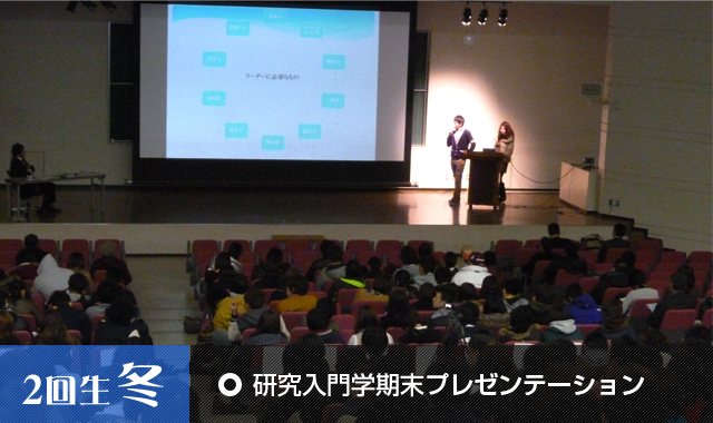 2回生の小集団科目の研究入門で学んだ内容をプレゼンテーションしました。各クラスの中から1組ずつ優秀な発表をしたグループが選出され、2回生全体を対象としたプレゼンテーションを行いました。このような研究入門の学習成果のアウトプットを通して、今後の研究の方向性や研究手法を明確化します。また、社会に出ても活かすことができる、大勢の前で発表する度胸や端的にものごとを効果的に伝える技術なども同時に身につけています。