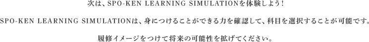 次は、SPO-KEN LEARNING SIMULATIONを体験しよう!SPO-KEN LEARNING SIMULATIONは、身につけることができる力を確認して、科目を選択することが可能です。履修イメージをつけて将来の可能性を拡げてください。