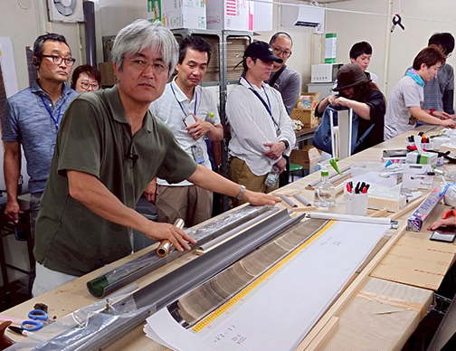 翌日は水月湖を訪れ、11年ぶりの年縞掘削の現場をクルーズ船で見学、実際に掘り上げた年縞を研究試料として保存する過程も見せていただきました。日程 2025年6月21日(土)~22日(日) 場所 年縞博物館・水月湖