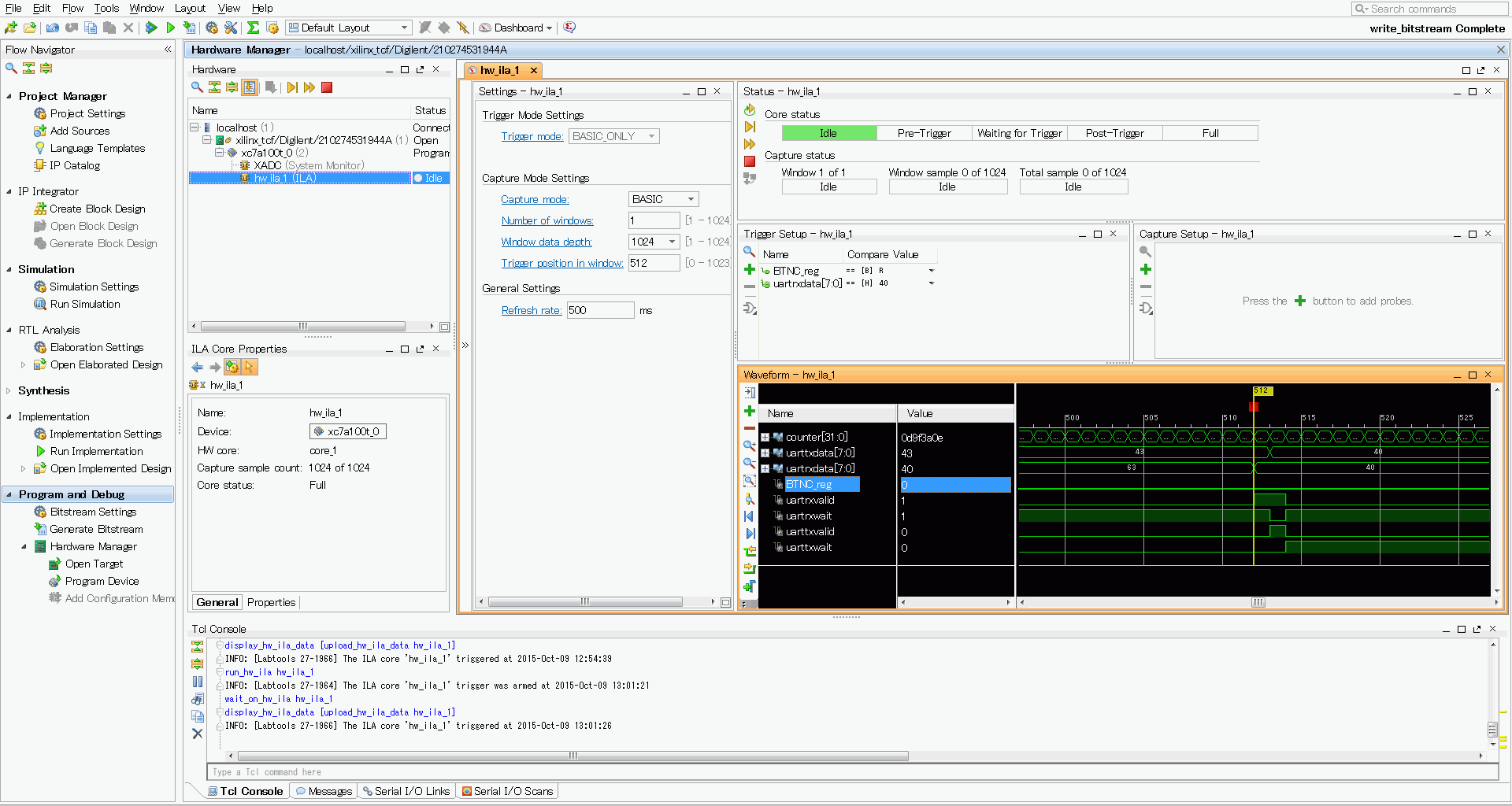 - Setting - hw_ila_1 (画面B3a) 内 Capture mode: BASIC, Trigger position in window: 512 (窓サイズ1024の中央)にする。